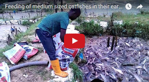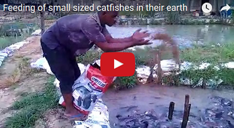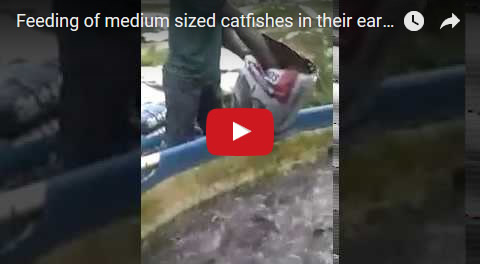 Feeding of medium sized catfishes in their earth pond at St Mosco Feed Nation Fisheries